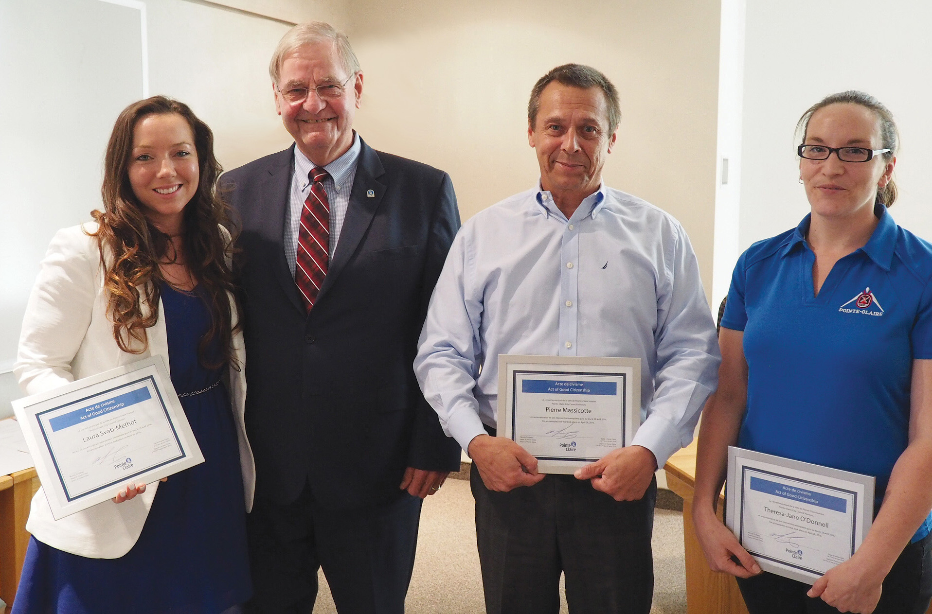Ms. Laura Svab-Méthot – Crestview School teacher, Mr. Morris Trudeau – mayor of Pointe-Claire, Mr. Pierre Massicotte – Pointe-Claire resident and Ms. Theresa-Jane O'Donnell – Aquatic Centre supervisor.