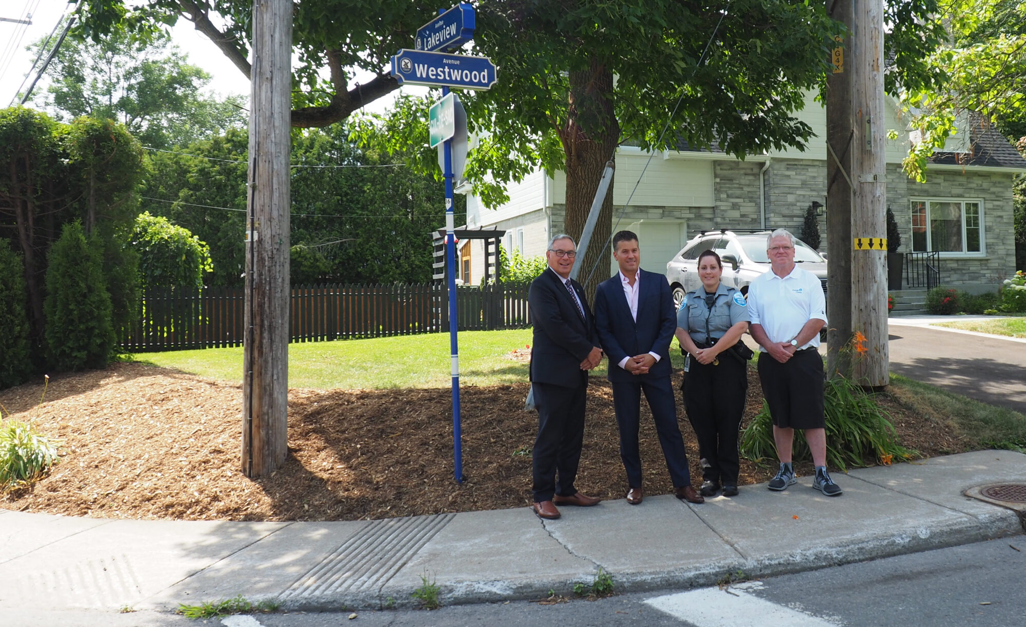 As an effort to keep his neighbourhood safe, resident, Jeremy Kenemy, has made the modifications to his property's sight triangle. He can be seen here in front of his property accompanied by the Mayor of the City of Pointe-Claire, John Belvedere; Genevieve Berlinguette, Inspector from the Inspection – Public Security Department and Claude Cousineau, Councillor for District 1.