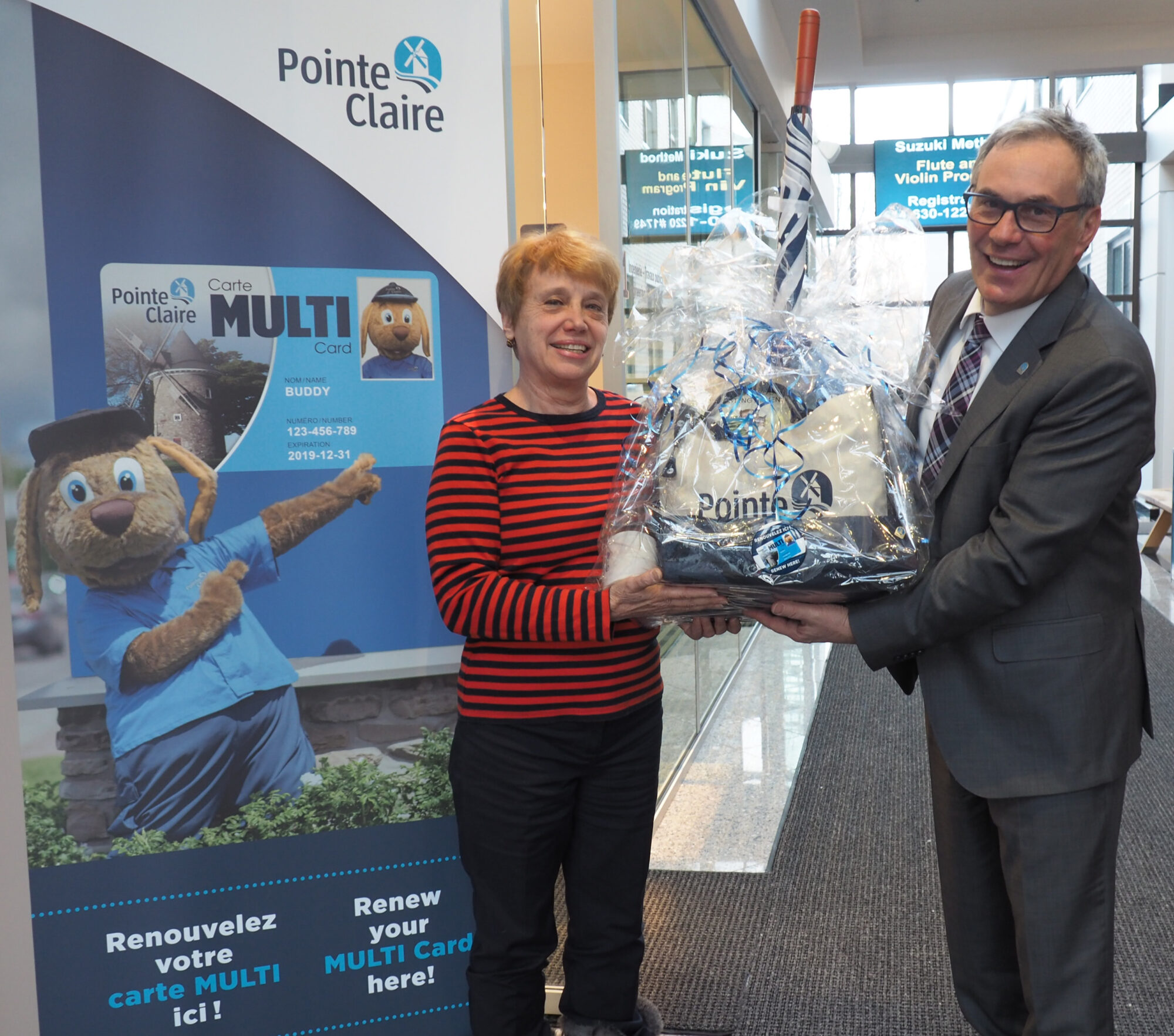 The mayor of the City of Pointe-Claire, John Belvedere, welcomed Ms. Martine Lheman, the winner of the MULTI Card renewal contest for December, at City Hall so she could receive her prize.