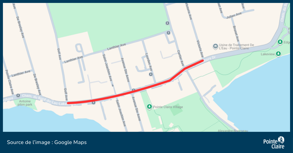 The City of Pointe-Claire would like to inform you that inspection of underground network will take place on Bord-du-Lac–Lakeshore Road, between Du Golf and Victoria avenues. The construction will require the closure of one lane at a time.