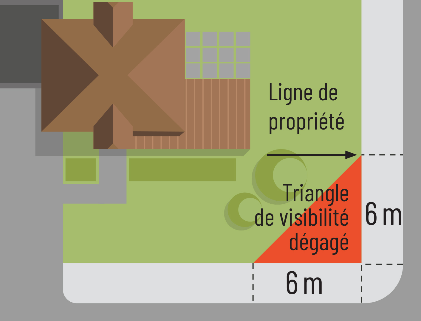 Votre propriété est située sur une intersection de rue? Assurez-vous qu’un triangle de visibilité soit maintenu dégagé en tout temps afin d’assurer la sécurité de toutes les usagères et tous les usagers de la route.